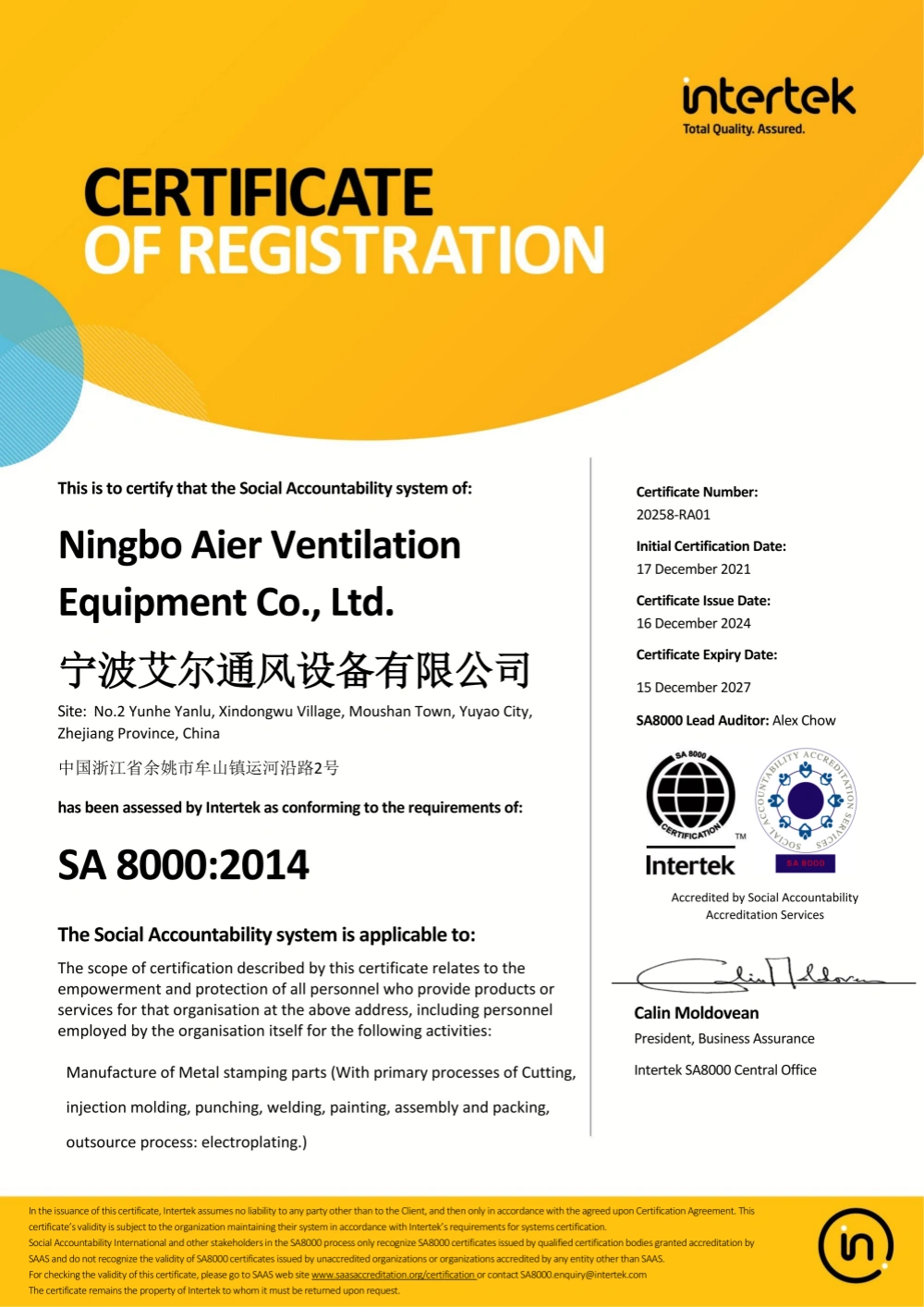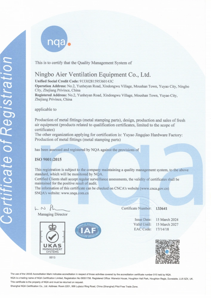 Ningbo Aier Ventilation Equipment Co., Ltd (Yuyao Jingqiao Hardware Factory) is one of the manufactories of metal stamping products in China, which was founded in 1997. Our factory covers 25,000 square meters and it’s located in Yuyao City, east coast of China, very closed to the ports of Shanghai and Ningbo.
